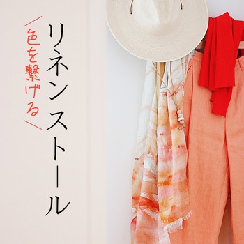 色を繋げる|ruinunoリネンストール 2024年06月08日 少ない服 神奈川県の三浦半島にアトリエを構えるテキスタイル作家 大類尚子さんのブランドruinuno天然素材を使い水彩画のような色彩&デザインに一目惚れ♡クタッとした肌馴染みの良いリネンに春に購入した朱赤&オレンジアイテムの色がストール1枚の中に大集結!↓↓↓↓↓↓↓↓↓