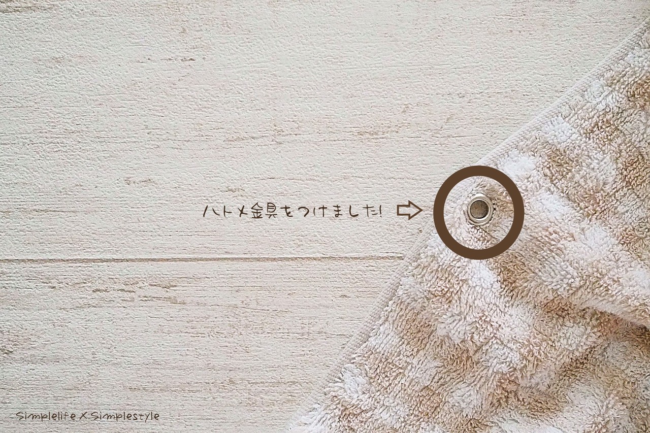 タオルの中央部分に穴を開け金具をつけています。