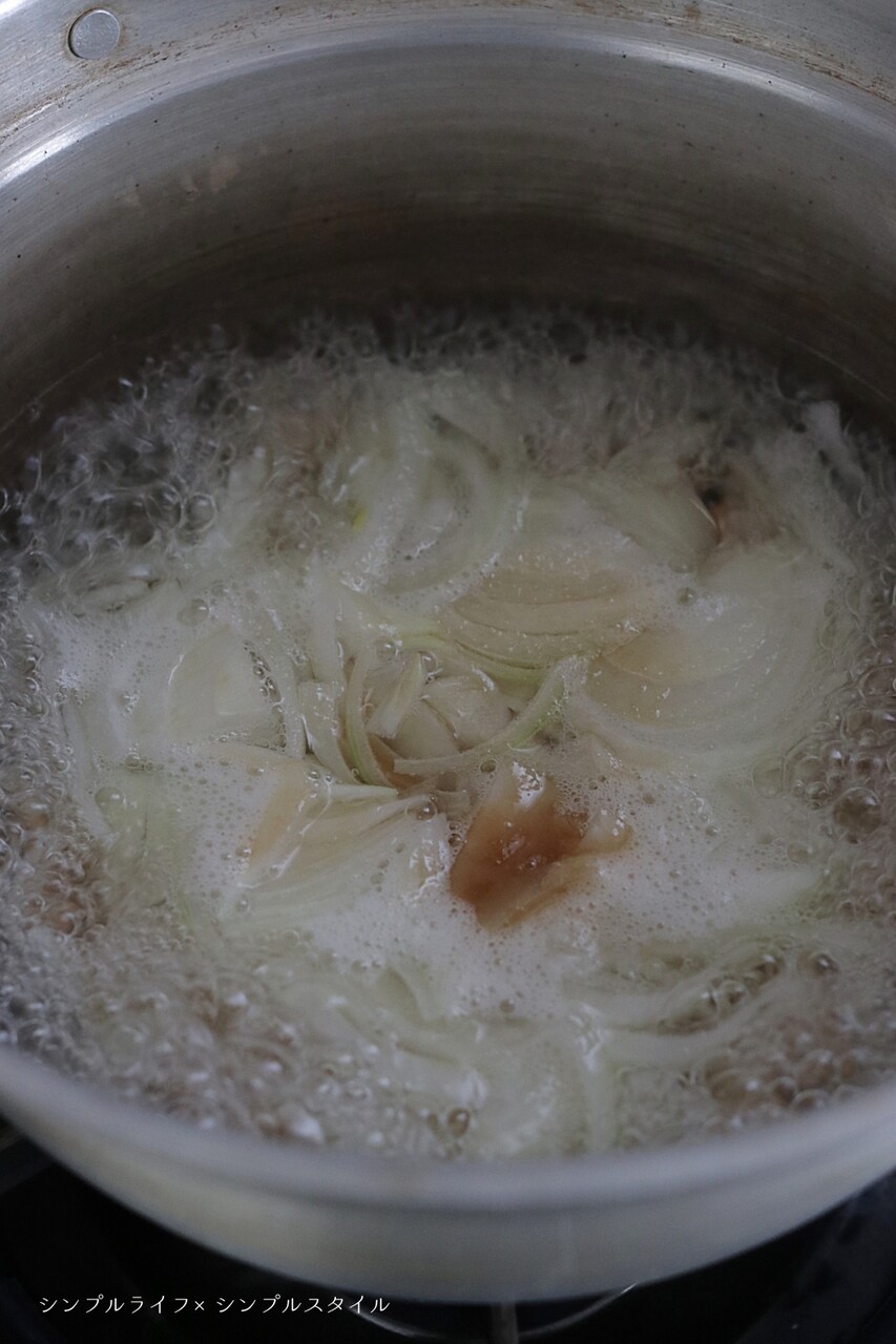 ①玉ねぎは薄くスライスし鍋に