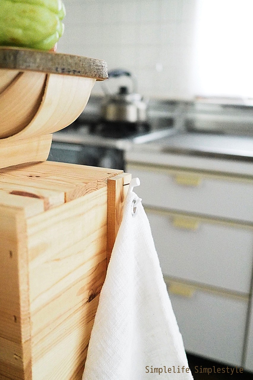りんごの木箱の食器棚にフックピンを付け