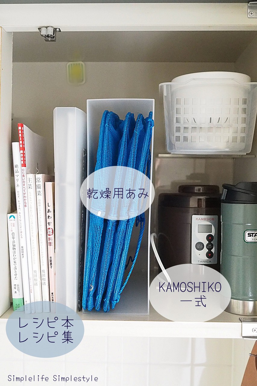 料理本・乾物用の網・KAMOSHIKO・水筒を収納しています。